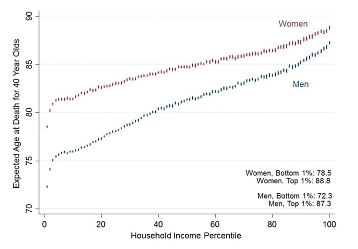 The richest American men live 15 years longer than the poorest men, while the richest American women live 10 years longer than the poorest women, according to the Health Inequality Project. Graphic courtesy of David Cutler