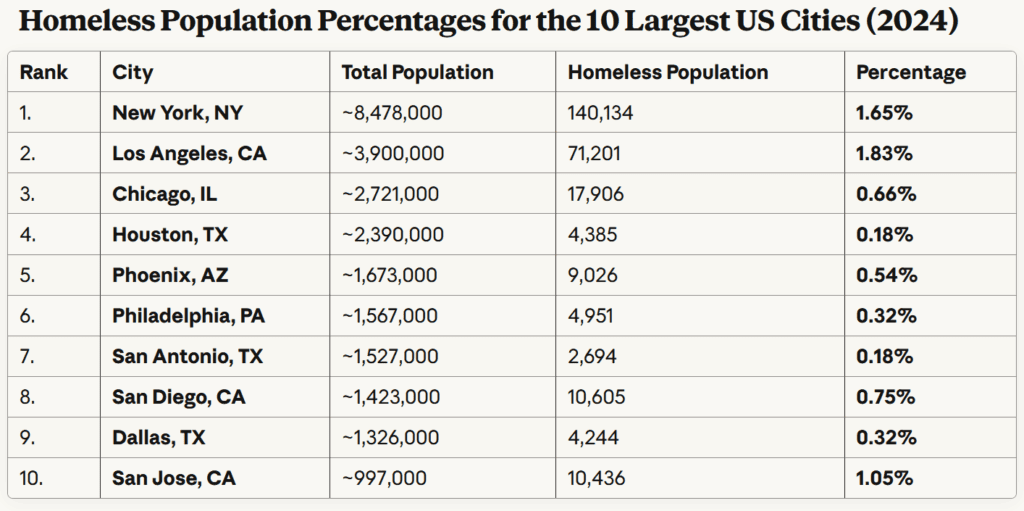 It is #11 with roughly 8,000 homeless people, 1% of population. About 2,900 are on the streets. Homelessness is a stain on our country, but contrary to impressions, SF does not stand out.