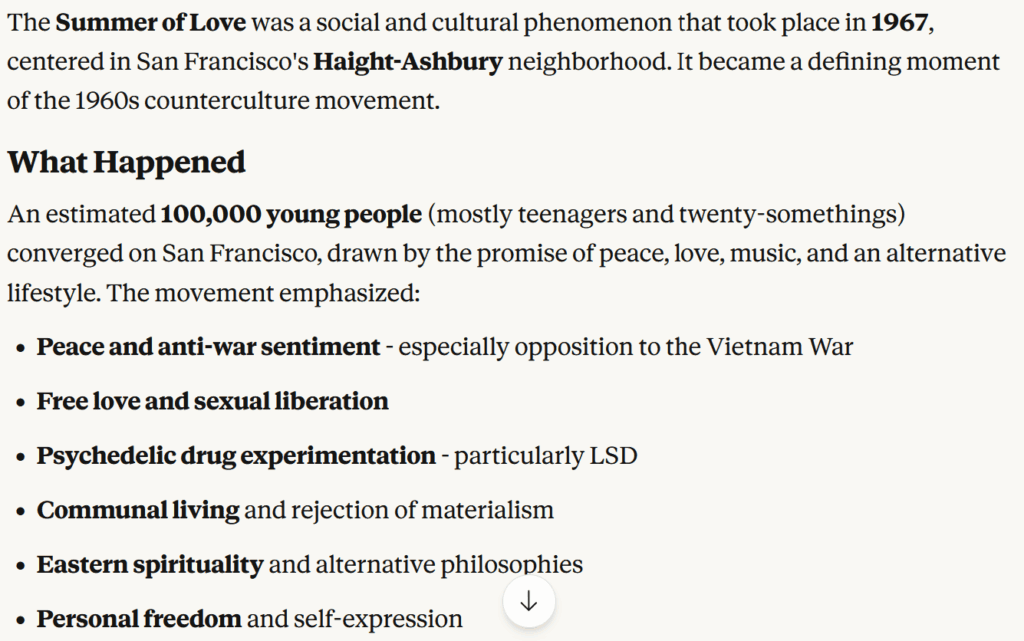 From the drug haze of 1967, today, the Summer of Love is probably copyrighted and when you go to HA, lots of Pinocchio-like stuff…Jim Hendrix souvenirs and so forth. You know, I’m just saying that sometimes the world can become a less interesting place. And eventually, everything winds up on a coffee cup.