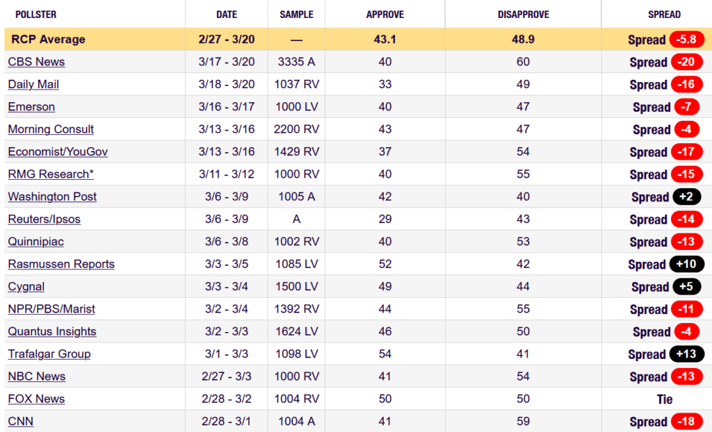 The country is bitterly divided. Real Clear Politics polling totals: