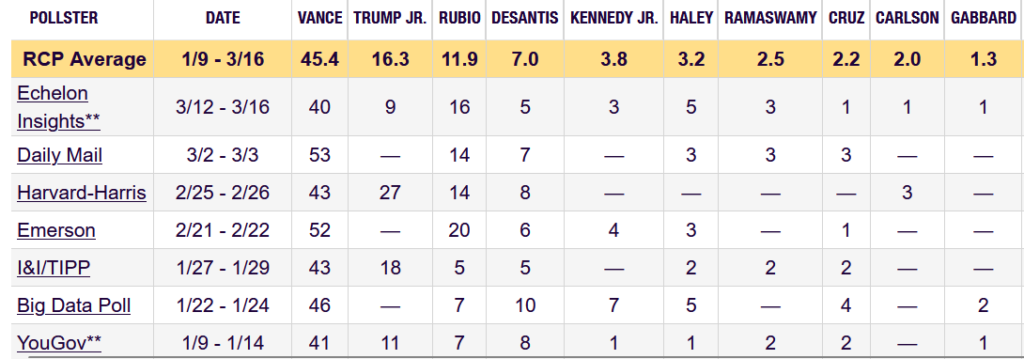 I find the Harvard-Harris poll curious. Are they saying that nearly 30% of Republicans are ready to usher in Trump Jr.? Seriously? And are those Reps really saying that Trump Jr. would make a better President than Rubio or DeSantis or Vance? I’m suggesting they need to prepare for the long fade of the MAGA movement. It had its time and place, but it’s not a permanent way to run the country.